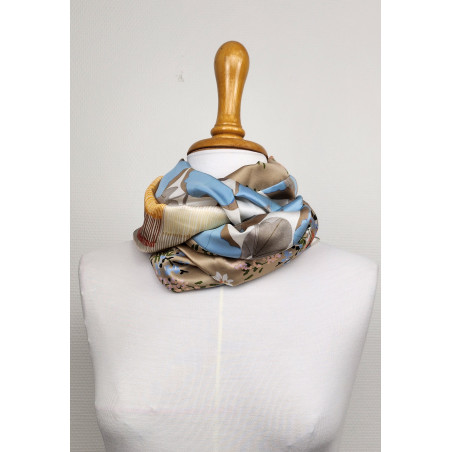 Composés d’un tableau en patchwork réalisé à partir de morceaux de soies imprimées et unies, de textures différentes, les snoods proposés sont tous des
