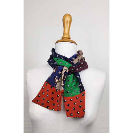 Composées d’un tableau en patchwork réalisé à partir de morceaux de soies imprimées et unies, de textures différentes, les cravates proposées sont toutes des pièces uniques.