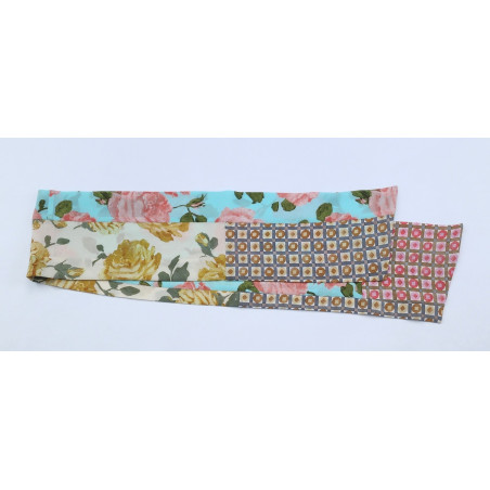 Composée d’un tableau en patchwork réalisé à partir de morceaux de soies imprimées et unies, les pièces proposées sont toutes des pièces uniques.